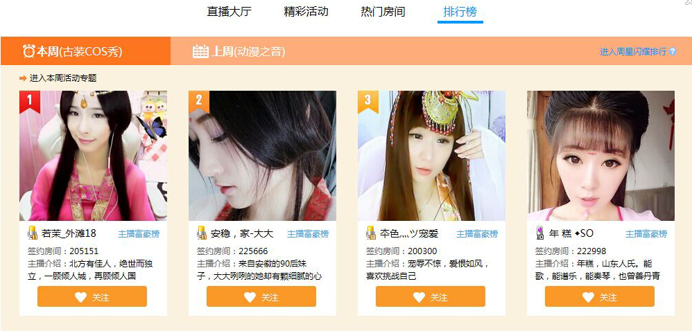 3、每周前4名主播拥有排行榜周星闪耀的展示位(展示位可直接对该主播进行关注,并进入主播所属房间)