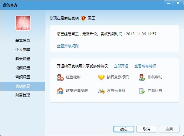 在我的齐齐中查看“贵族信息”,钻石贵族可以看到自己的钻石等级、成长值、到期时间,爵位贵族可以看到自己的爵位、到期时间、保级升级的进度提示